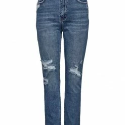 – Straight Fit-Jeans- High Waist- Destroyed Details- 5-Pocket-Style- Gürtelschlaufen- Dehnbarer Stoff- Schrittnaht: 72 cm bei Größe 28/34- Das Model trägt Größe 28/34